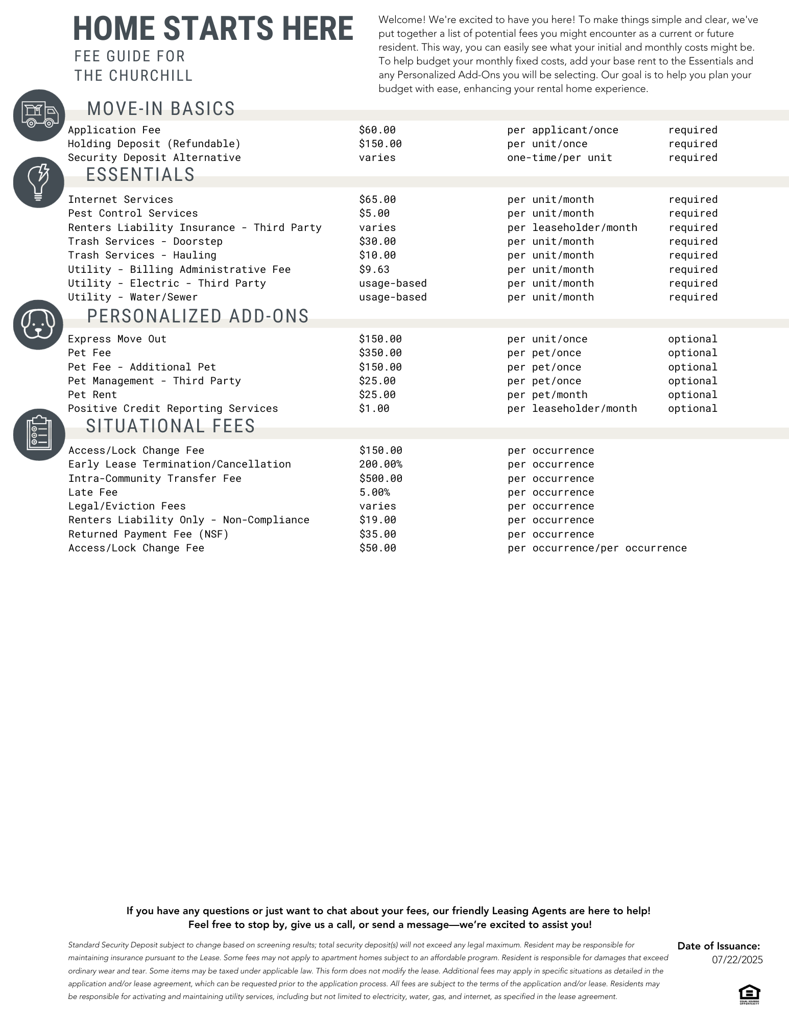 Here’s a quick rundown of fees you might encounter as a current or future resident. Your monthly costs include base rent, Essentials (like utilities), Personalized Add-Ons (e.g., parking or pet rent), and any situational fees such as security deposits or early lease termination. It’s all about helping you budget better and making your rental experience smooth and hassle-free!